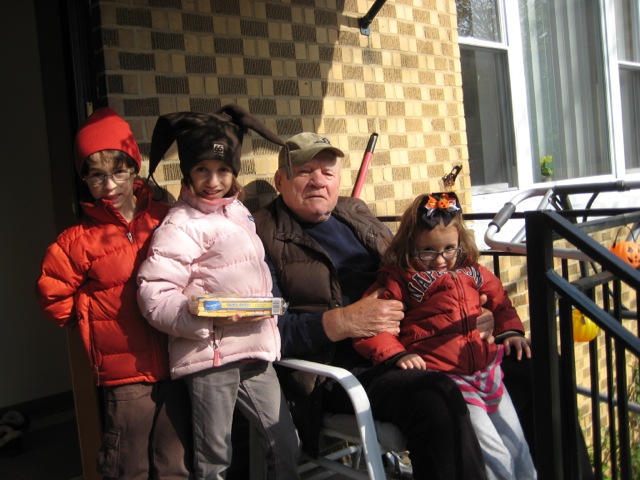 I’m sure that some of it was age and the loss of his hearing, and I imagine that some of it was seeing the world change around him: friends died, neighbors moved away. His grandchildren had children and we saw each other less often as we moved into our own lives. But whenever we came together, he was happy to be with his family, proud of his children and grandchildren. His smile still had the same warmth, his blue eyes the same twinkle. His hugs may not have been as strong, but they conveyed the same big-hearted love.