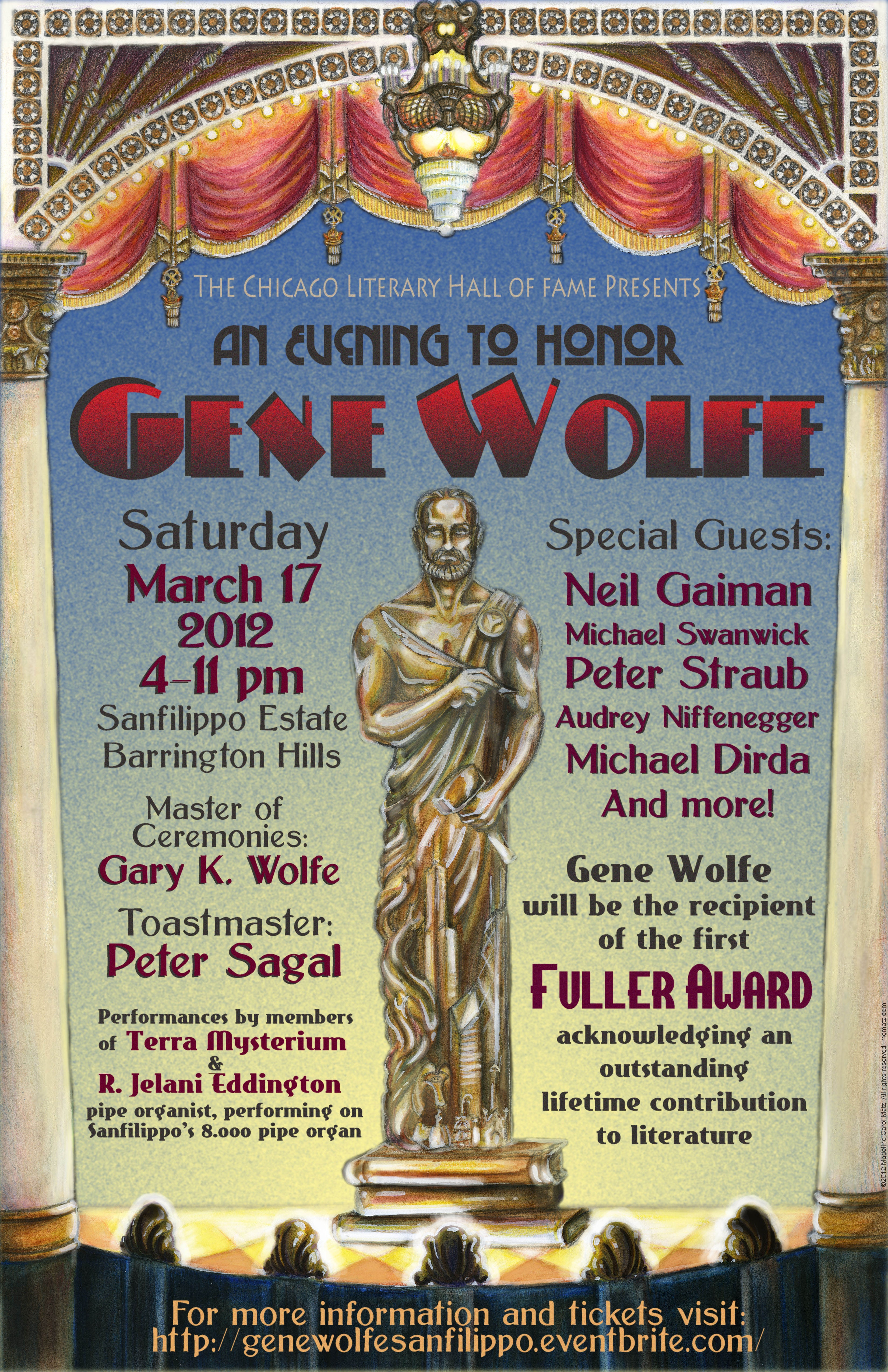In 2012, it was my privilege to help develop a new award for the Chicago Literary Hall of Fame, the Henry Blake Fuller Award, honoring a living author for their outstanding lifetime contribution to literature. We honored Gene Wolfe with the first Fuller at a beautiful ceremony at Sanfilippo Estate in Barrington Hills on March 17, 2012. My account of the evening is here on my blog. It was magic.