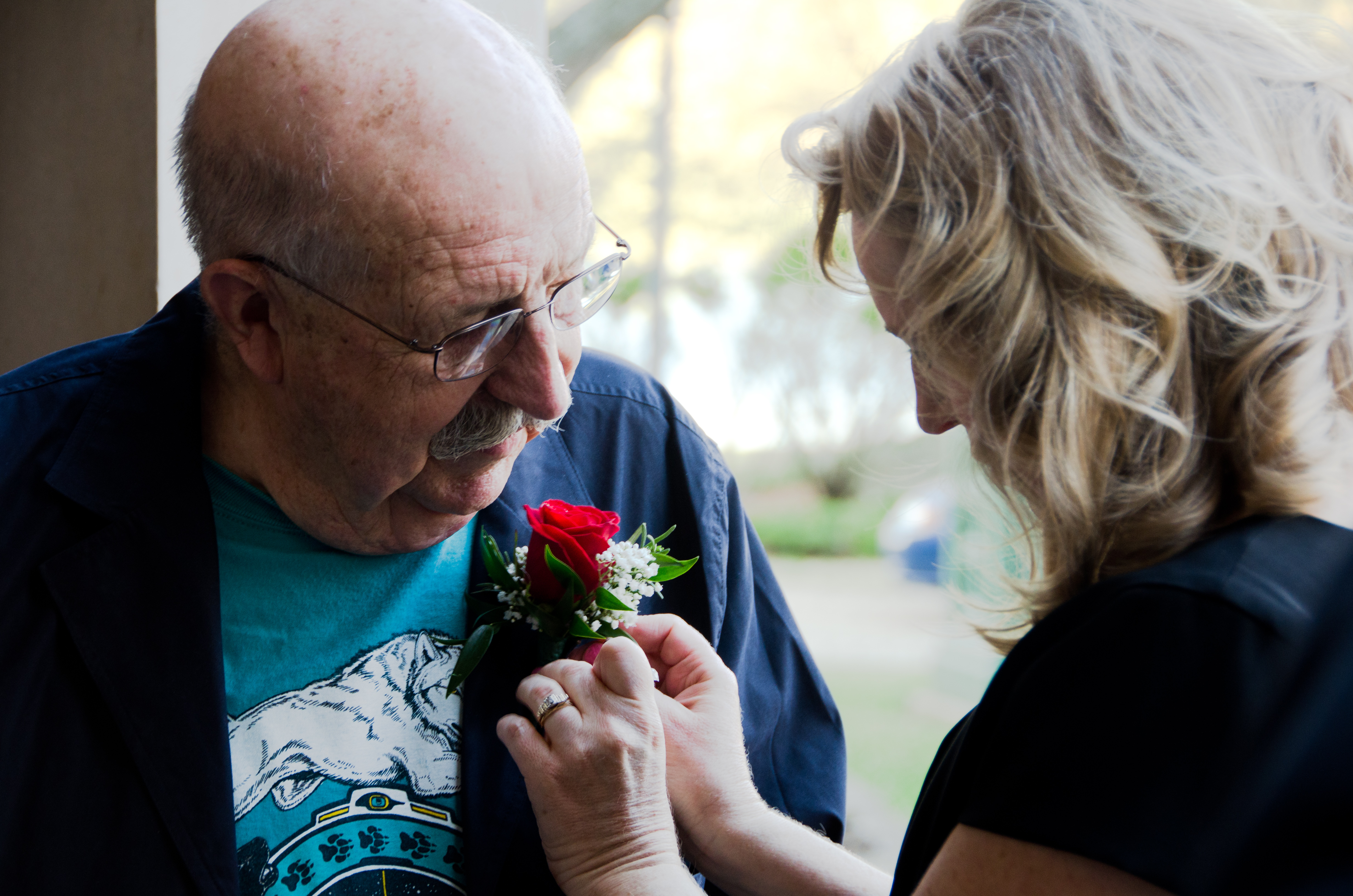 Teri Goulding pins the boutonnière on her father, Gene Wolfe. (Photo by Carl Hertz)